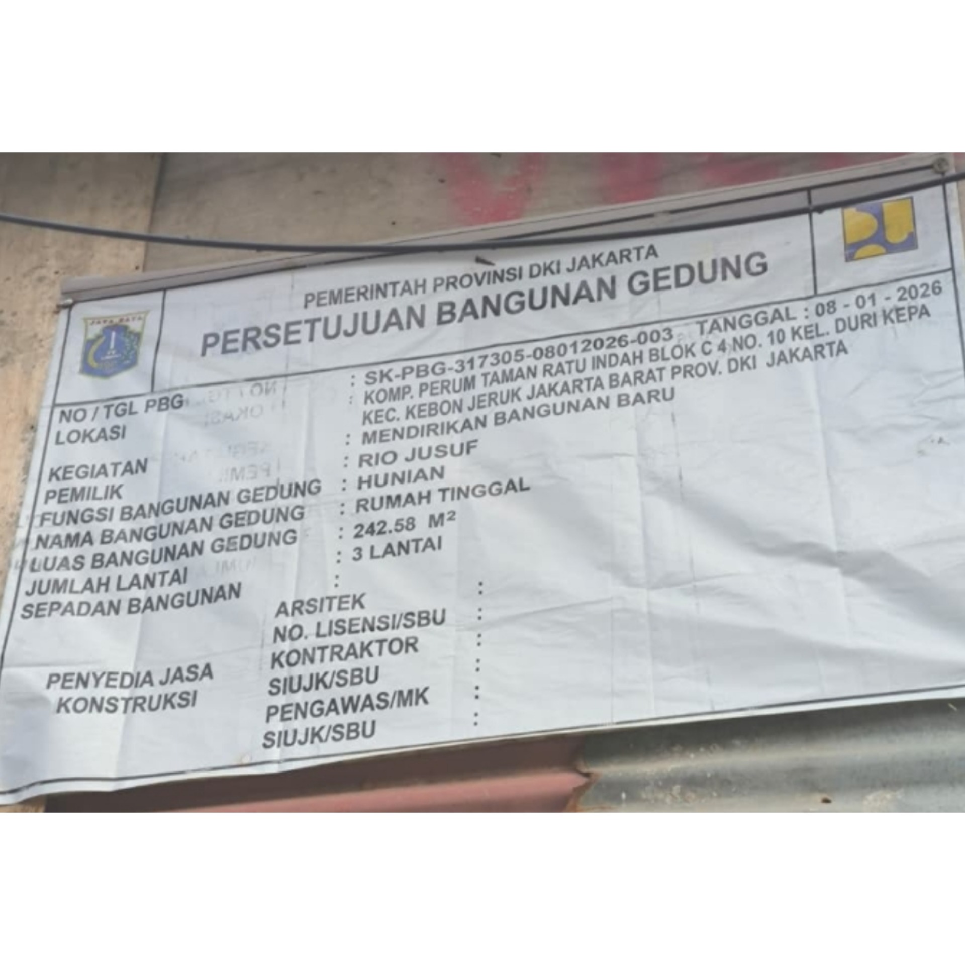 Dugaan pemalsuan ini setelah diketemukan plang izin dengan no SK-PBG-317305-08012026-003 tertanggal 08-01-2026 yang terletak di daerah kebun jeruk jakarta barat.